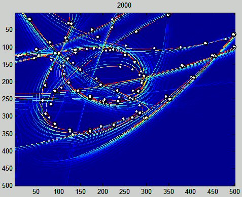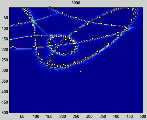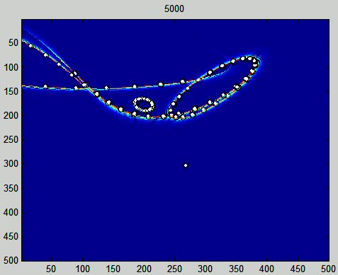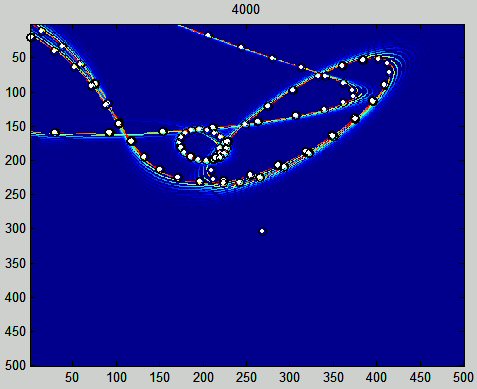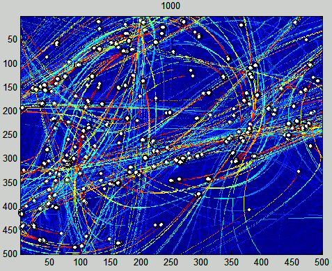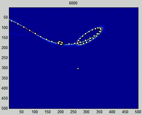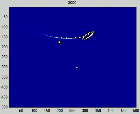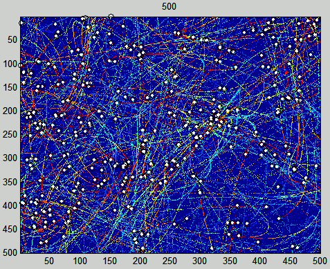 For alpha=1, each agent chooses another and follows. There are 1000 agents on a 500x500 field. The snapshot example is disconnected into three swarms. This is evident in that convergence is to three points. The avi movie also has disconnedted swarms. The step size is gamma = 0.01 for the snapshots and 0.02 for the movie.