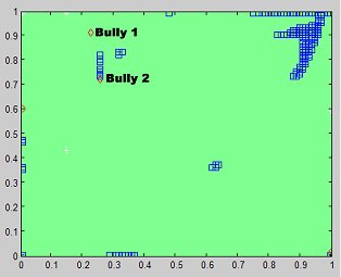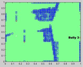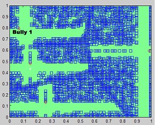 Dweebs adhere strictly to taking a step from the nearest bully - to the disadvantage of the dweebs. The massacre effect emerges. White +'s denote death spots of dead dweebs. There are four bullies, 5,000 dweebs, and, in the end, nine massacre spots.