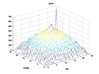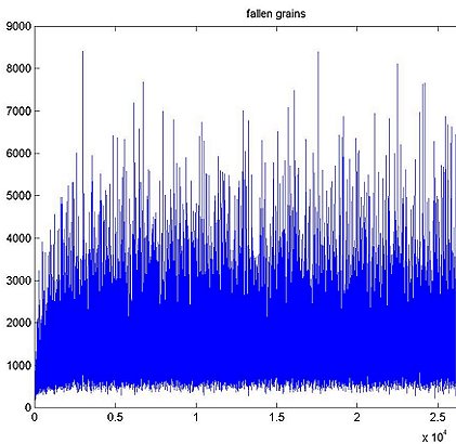 In this emulation, a pile of sand is mimicked. Sand is dropped on a single point. If an adjacent point is lower, there is a leveling of sand size. The new point might level some of its sand on a neighboring point, etc. The examples here are for a 25 by 25 sandbox. (Other sizes can be emulated using the provided Matlab code.) At the right is an example of a stack in steady state. When new sand is dumped (100 grains at a time), almost as much falls off of the table as is added. There are 137006 grains on the table and, in the last dump (number 26101) of 100 grains, 882 grains were dislodged